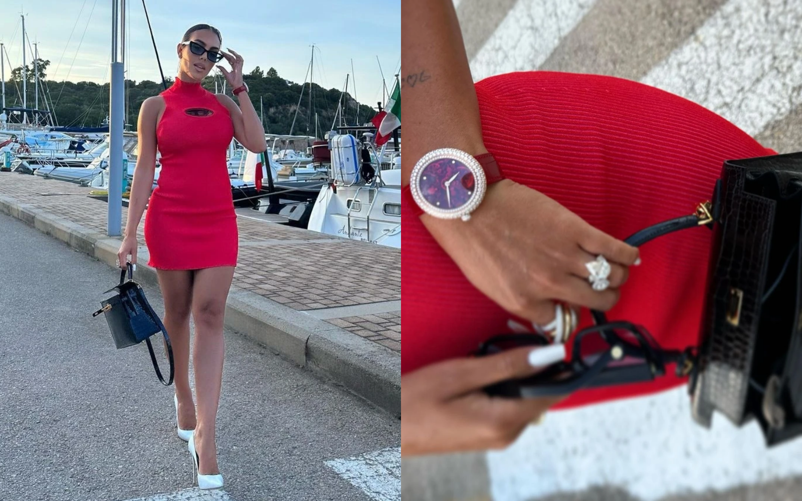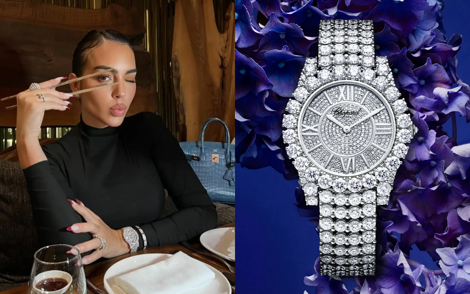 Tuy nhiên, bên cạnh những món trang sức lấp lánh, Georgina Rodríguez còn nổi tiếng với gu đồng hồ xa xỉ, thường xuyên diện những mẫu đồng hồ đính kim cương trên cổ tay.